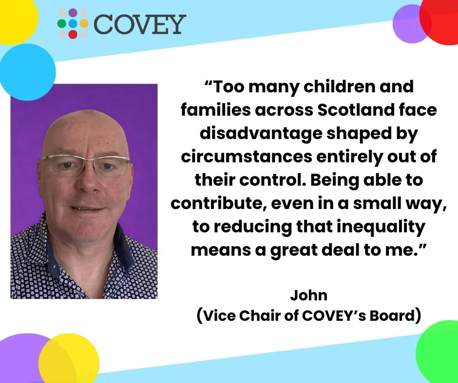 My journey to joining the Board began with many years of working in social work services, where I first came to know COVEY in the late 1990s. Even then, it was clear that the organisation provided a lifeline to families, support that (in some cases) was vital to their survival.